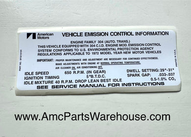 1972 AMC 304 V8 ENGINE EMISSIONS DECAL AUTO