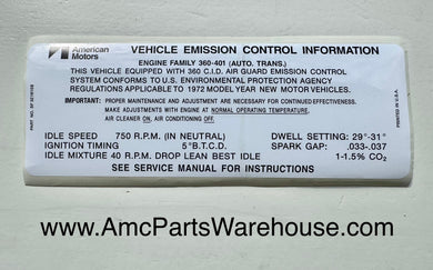 1972 AMC 360 V8 ENGINE EMISSIONS DECAL AUTO