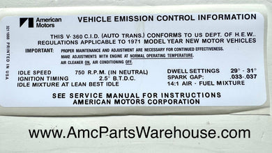 1971 AMC 360 V8 ENGINE EMISSIONS DECAL AUTO