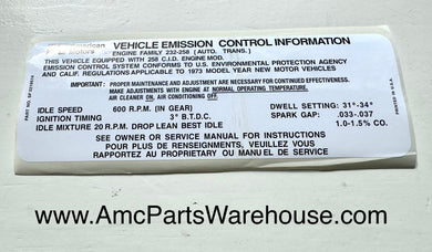 1973 AMC 258 ENGINE EMISSIONS DECAL AUTO
