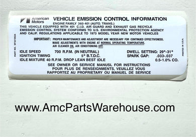 1973 AMC 401 V8 ENGINE EMISSIONS DECAL AUTO