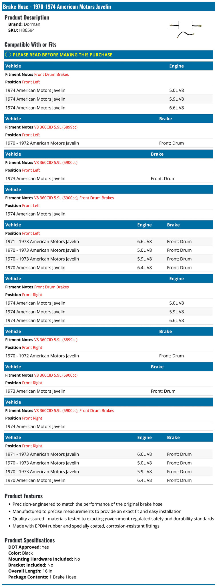 Package Contents: 1 Brake Hose