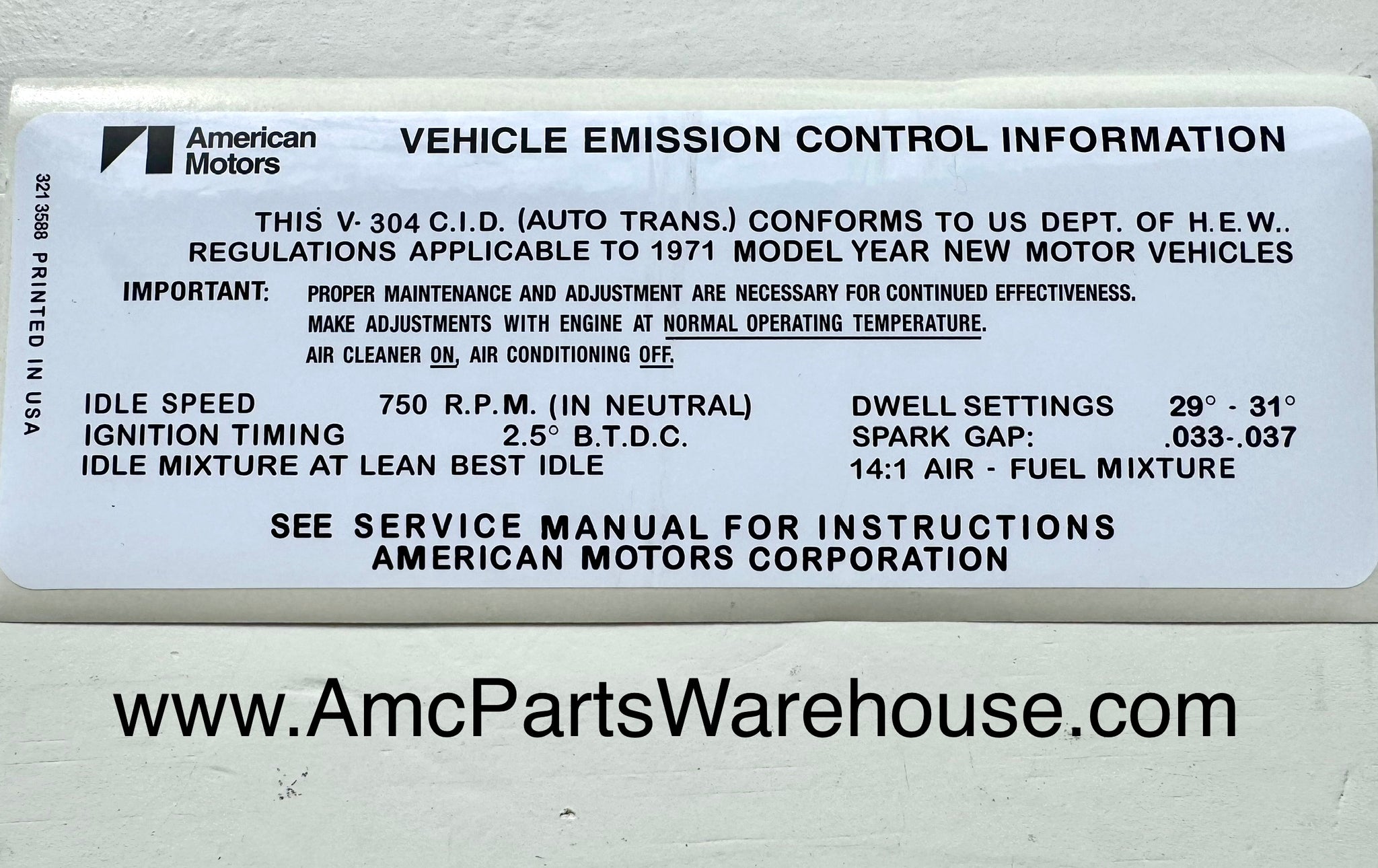 1971 AMC 304 V8 ENGINE EMISSIONS DECAL AUTO. All models for 1971.