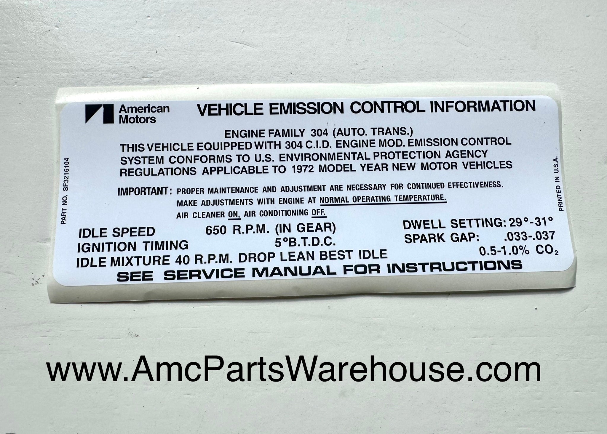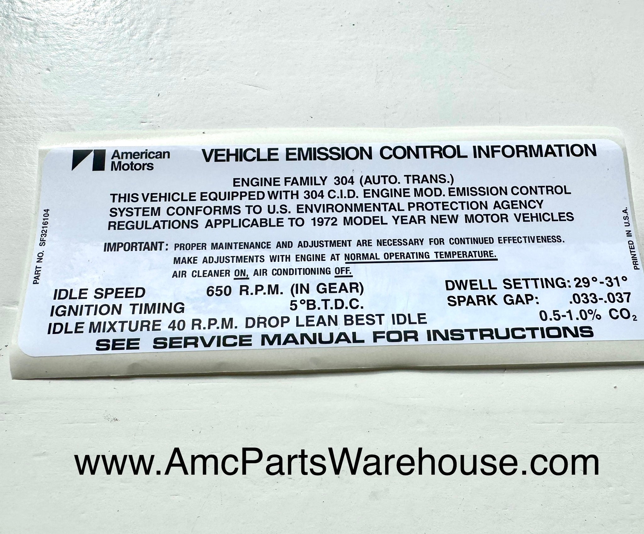 1972 AMC 304 V8 ENGINE EMISSIONS DECAL AUTO. All models for 1972.
