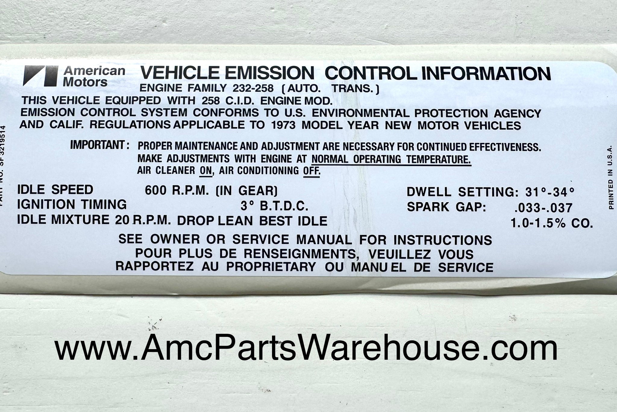 1973 AMC 258 ENGINE EMISSIONS DECAL AUTO. All models for 1973 with 258.