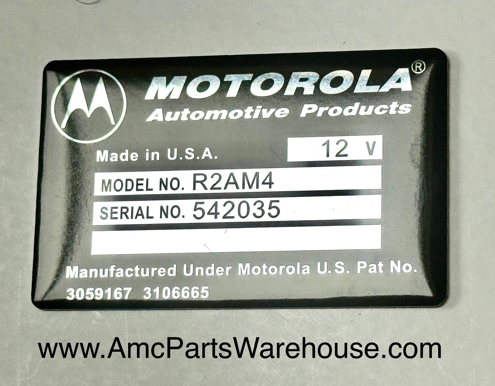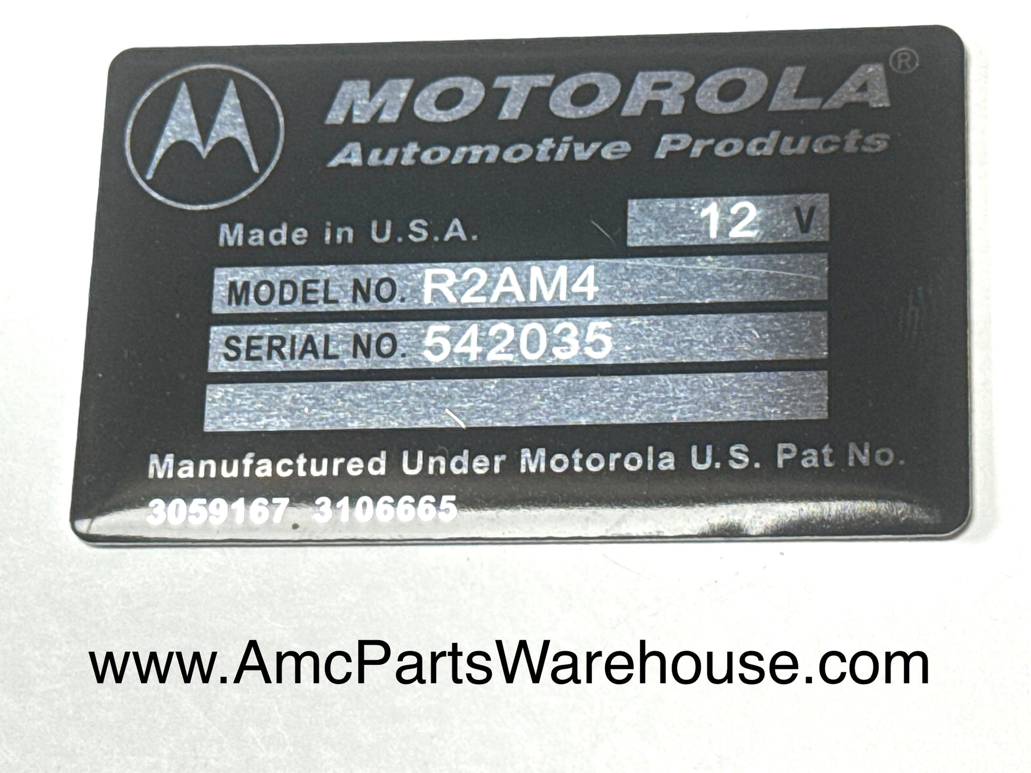 AMC Motorola voltage regulator reproduction tag. R2AM4 1969-70. Show condition. Aluminum with 3M backing for easy installation.