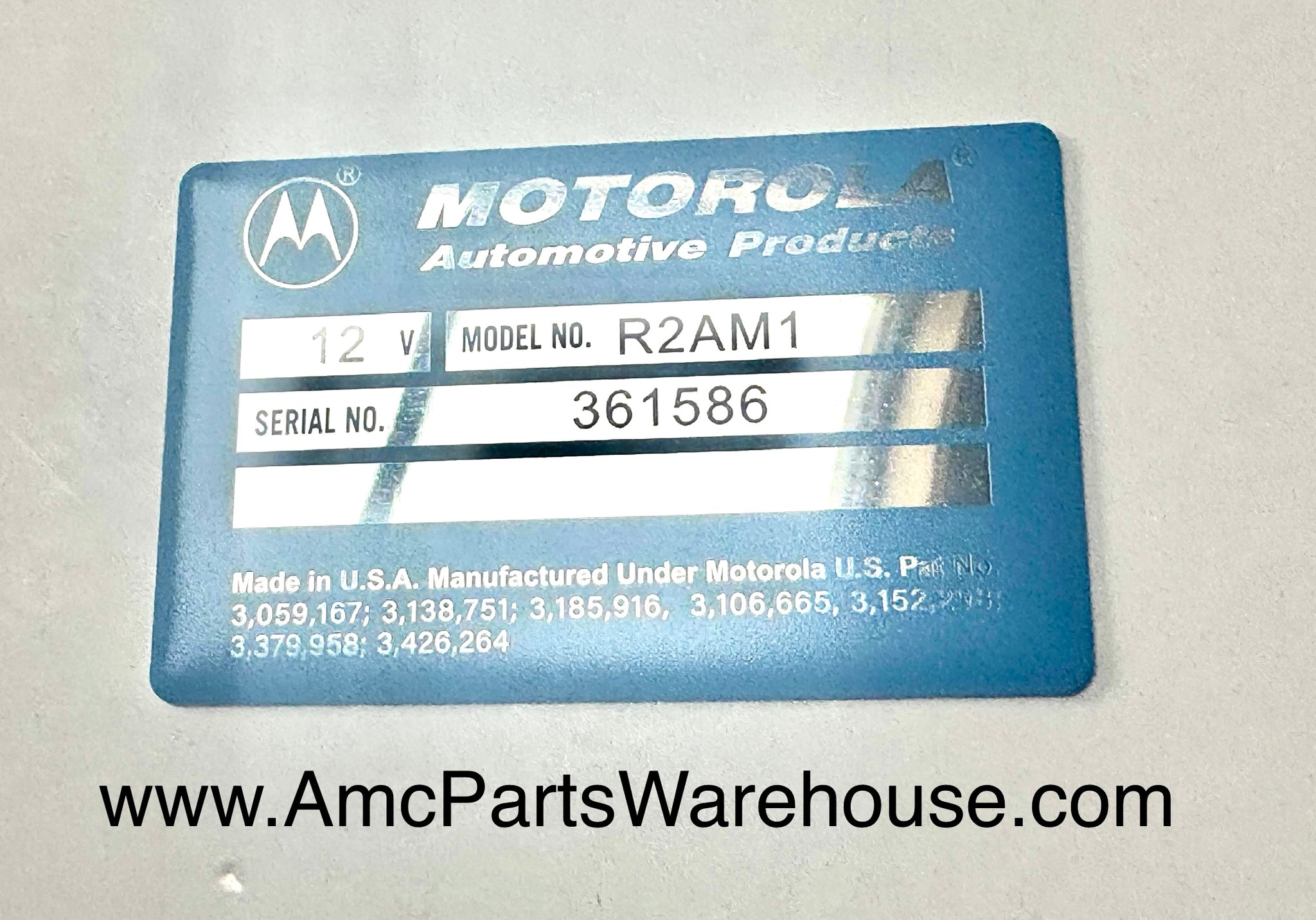 AMC Motorola voltage regulator reproduction tag. R2AM1 1966-68. Show condition. Aluminum with 3M backing for easy installation.